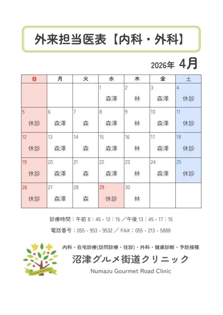 当院の2026年2月の診療体制表です。皆様のご来院を心よりお待ちしております。